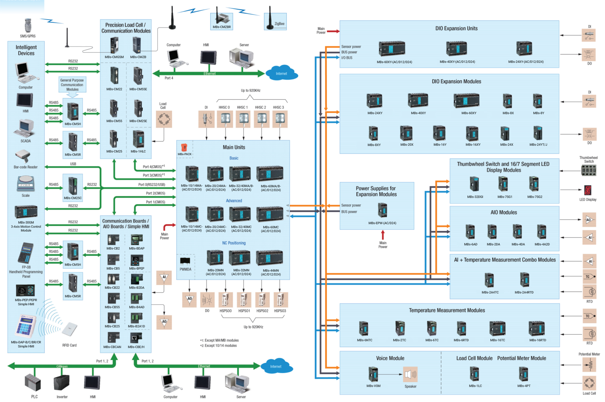 In addition to over 200 models of main CPU units, the MBs-PLC also provides about 100 models of expansion I/O for selection. The expansion I/O modules include basic DI/O, AI/O and other communication modules, also include thumbwheel switch input module, 16/7 segment LED display module, 8 types (J, K, R, S, E, T, B, N) thermocouple, Pt100, Pt1000 RTD temperature measurement modules. There is also a new additions to the range including load cell module used in weighting, potential meter module used in measuring position, and a user-friendly voice module. The MBsPLC also provides a MBs-DAP or MBs- PEP simple HMI which can be linked together with a single RS485 bus. The MBs-DAP or MBs-PEP can be a simple Timer/Counter editor or it can also be used as a simple human machine interface through the function of user definable keys and message display. The MBs-DAP or MBs-PEP can be equipped with a wireless RFID sensing module and can be applied to such applications as entrance control, parking equipment and elevator control amongst others.